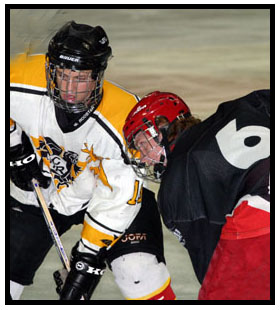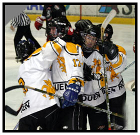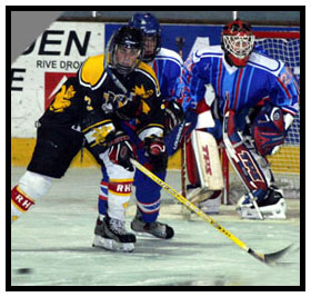 A la reprise, les « noirs & jaunes » semblaient beaucoup plus véloces. Bien que toujours maladroits, les Normands affichaient de meilleures ambitions à l’offensive. Ainsi, Lucas Bini à bout portant tentait de déjouer en vain le portier volants (22’33) tandis que Martin Croguennec provoquait la panique dans la défensive francilienne sur un tir à la bleue que Lucas Bini ne pouvait convertir au rebond (27’14) Chahutés, les Parisiens pliaient sous les accélérations de Lampérier seul devant la cage (28’51) et Dufournet qui manquait l’immanquable après un mouvement habile lui ouvrant grande la cage (30’18) avant de rompre finalement face à Julien Correia qui profitait d’une passe de Lionel Tarantino pour redonner l’avantage aux siens (3-2 à 30’29) Dans la foulée, électrisé par une chevauchée fantastique qui se terminait par une intervention du portier parisien, Antoine Roussel mettait à nouveau le poudre. Sur une passe de son compère Nicolas Motreff, plein de sang froid, le « petit Antoine » allongeait le gardien d’une feinte avant de glisser la rondelle au fond des filets pour le quatrième but (4-2 à 32’15) Le break fait au tableau d’affichage, inconsciemment les esprits rouennais se relâchaient à nouveau. Même si Edouard Dufournet (33’38) puis Lionel Tarantino en contre (34’56) gardaient un soupçon de pression sur leurs adversaires, le spectre de l’égalisation sur la sirène du premier tiers, faisait surface par l’intermédiaire de Benjamin De Avelar qui giflait les Dragons en ramenant les siens à un but à quelques secondes de la deuxième trompe (4-3 à 39’36) Avec le soufflet reçu avant la pause, piqué au vif, le troisième tiers sera cette fois complètement acquis à la cause du Dragon. Même si Levot faisait illusion sur une échappée (41’57), Loïc Lamperier se chargeait de ramener à la réalité les Volants en inscrivant le cinquième but des Dragons (5-3 à 43’32) Sans doute émoustillé par les encouragements de « Lili », Julien Correia tout feu tout flamme enterrait définitivement les espoirs franciliens avec un sixième but assassin pour les Volants (6-3 à 45’16) Les patins vissés profondément dans la glace, exténués par l’intensité du jeu rouennais, les Parisiens ne pouvaient qu’assister en spectateur à la fin de match et au septième et dernier but des rouennais signé d’Erwan Agostini au rebond sur un tir d’Antoine Roussel, l’audacieux minime qui signait de son empreinte la rencontre avec un but et trois passes, de bonne augure avant la rencontre du lendemain face à un adversaire sans doute plus coriace avec la venue de l’association Bordeaux / Anglet.