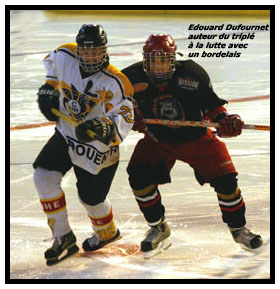 Plein d’intelligence, au lieu de lancer à la cage, le toulousain choisissait la surprise en glissant la rondelle en soutien pour le lancer d'R1 (Erwan pour Catie) Agostini qui foudroyait le gardien bordelais (0-1 à 15’14) La machine lancée, les coups de boutoirs rouennais finissaient par enfoncer la porte de la forteresse girondine jusqu’alors infranchissable par Peter Bourgaut qui se servait de sa crosse comme d’un lance missile, le palet filait à ras de glace pour mourir au fond des filets bordelais après un énorme travail contre la bande de sa ligne pour éviter que la rondelle ne sorte de la zone (0-2 à 16’08) Il ne restait plus qu’aux jeunes Dragons à rentrer au vestiaire avec deux buts d’avance au tableau d’affichage. A la reprise, les évènements se précipitaient pour les Bordelais. Mitraillés, la cause rouennaise semblait l’emporter avec des accélérations significatives qui creusaient l’écart à la marque sous l’impulsion d’Alexandre Sucré (0-3 à 24’20) et surtout par Edouard Dufournet qui s’offrait un but d’école en feintant le tir avant de tromper le portier du revers, waouh ! Splendide ! (0-4 à 24’32) La douche était glacée sur le banc bordelais qui ne savait plus à quel saint se vouer. Sans doute pas à saint Lionel qui manquait de peu de crucifier le portier girondin dans la foulée sur une échappée infructueuse (26’25) Malheureusement, l’ouragan rouennais n’allait pas tarder à retomber aussi vite qu’il avait surgit. En effet, après avoir courbé l’échine, après avoir reçu coup sur coup en pleine face, après avoir frôlé de prêt le K.O, les Bordelais finissaient par redresser la tête et infliger quelques coups bien sentis aux Dragons. Tenaces ces girondins qui ne lâchaient pas l’affaire et qui revenait à 1-4 sur un but signé de Nicolas Mariage qui dépoussiérait plutôt habilement la lucarne rouennaise (27’50)