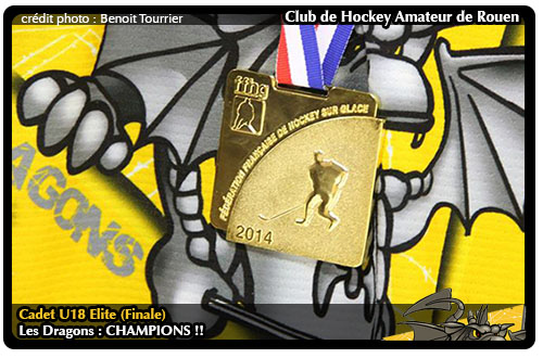 Qu'elles sont savoureuses ces minutes qui suivent la sirène finale du deuxième match de la finale U18 Elite qui sacre les Dragons de Rouen, champions de France 2014 au terme d'une rencontre à suspense dénouée sur le score de 3-2. Le 19ème titre pour l'histoire de Club de Rouen en Hockey Mineur, le 6ème en Cadet pour le Club au Dragon, la 42ème médaille pour l'étendard jaune et noir mais surtout un océan de sourires, un raz de marée d'émotions pour cette équipe haut-normande fière de porter haut ses couleurs et de célébrer d'un seul Dragon ce titre 2014 au prix d'une finale à laquelle il faut associer le valeureux adversaire vaincu, Amiens qui aurait mérité tout autant de soulever la Coupe mais cette après-midi du 23 mars 2014, les Dieux du Hockey s'étaient parés le visage de « jaune et de noir ».